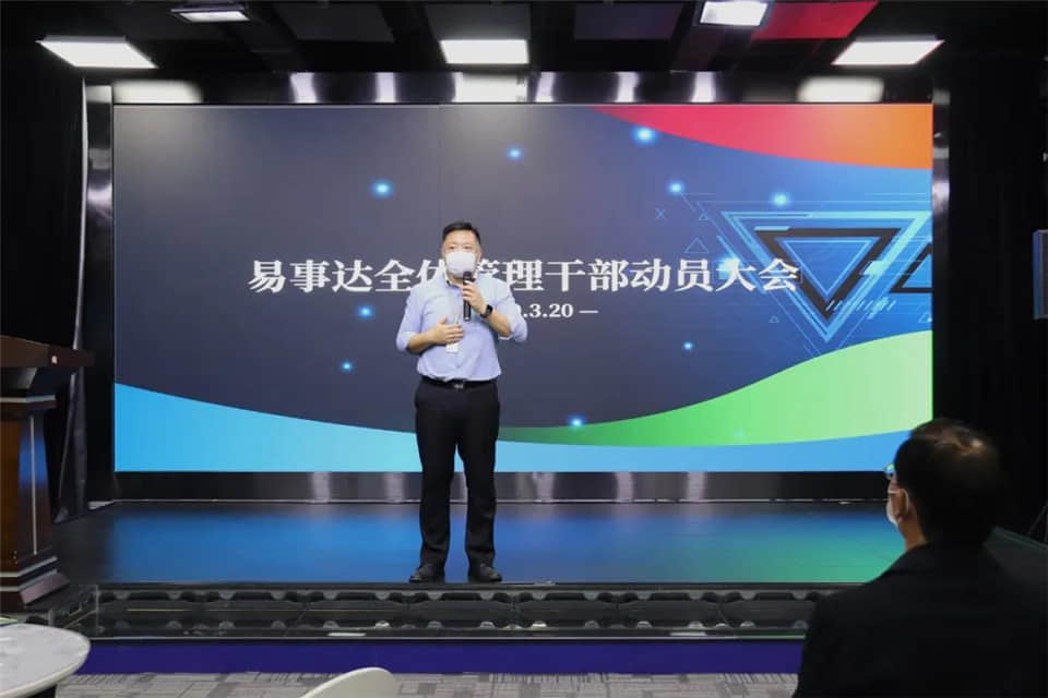 3月20日上午10點半,易事達全體管理干部在三樓展廳舉行動員大會,集團董事長劉虎軍先生、易事達董事長兼總經(jīng)理吳錚、首席財務官王廣彥以及公司管理干部參加會議。