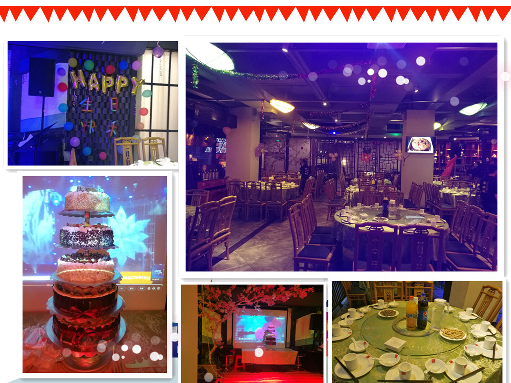 生日會分三個流程進行,由壽星領(lǐng)導(dǎo)為10-12月壽星送祝福,一起分享生日蛋糕,享受晚餐美食三部分組成。在壽星領(lǐng)導(dǎo)送祝福環(huán)節(jié),品質(zhì)部于經(jīng)理和研發(fā)二部胡總監(jiān)作為領(lǐng)導(dǎo)代表對我們在場的壽星送上了真摯的祝福?!白D闵湛鞓?,祝你生日快樂”伴隨生日歌的唱響,許愿與分享蛋糕時刻就到來了,五層的生日蛋糕,寓意壽星們步步高升,甜甜的蛋糕,甜甜的心情。享用了生日蛋糕后,就進入了晚餐正式時刻,一盤盤美食上桌,大家舉杯同祝。