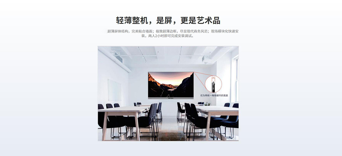 超薄屏體結(jié)構(gòu),完美貼合墻面;極致超薄邊框,盡顯現(xiàn)代商務(wù)風(fēng)范;現(xiàn)場(chǎng)模塊化快速安裝,兩人2小時(shí)即可完成安裝調(diào)試。